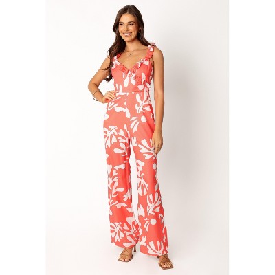 Coolmee Women's Casual Loose Overalls Square Neck Ruffled Hem Jumpsuits One Piece Long Sleeve Floral Printed Wide Leg Rompers With Pockets L Pink