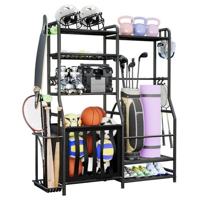 MOEPISY Garage Sports Equipment Organizer, Golf Bag Storage Rack, Heavy Duty Ball Holder with Basket & Hooks