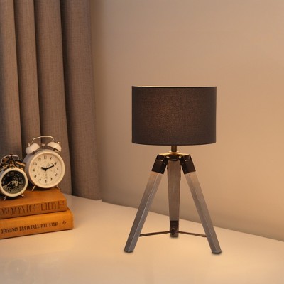 18" Industrial Wood Tripod Table Lamp with Linen Drum Shade and Metal Accents for Bedroom, Living Room, Study, or Hotel