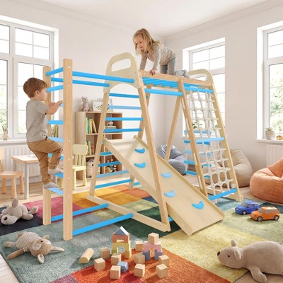 7-in-1 Jungle Gym Playset | Indoor Wooden Kids Climber & Playground,Play Set with Slide. Rock Wall. Ladder. Net. Rest Area & Maze for Toddlers