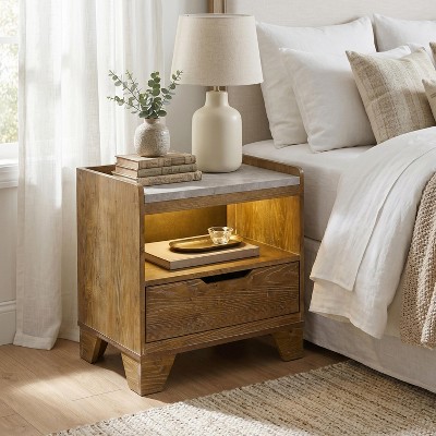 BALHAM TRADE-Nightstand with USB Charging Station Rustic Wood Side Table LED Light Adjustable Shelf