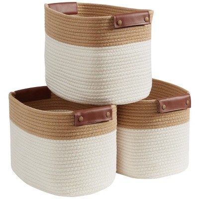 Ornavo Home 3 Pack Cotton Rope Shelf Storage Basket with Faux Leather Handles