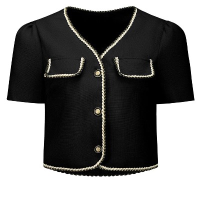 Hobemty Women's Tweed Contrast Trim Button Down Short Sleeve Work Office Blazer