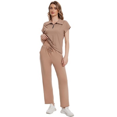 Womens Elegant Casual Sets Knitted Sweatsuit Sets 2 Piece Outfits with Sweater Short Sleeve Tops and Wide Leg Sweatpants