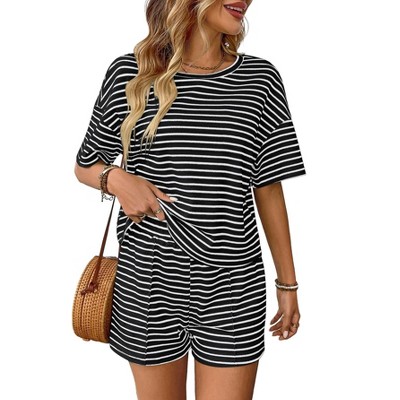 Coolmee Women's Striped 2 Piece Sets Short Sleeve Oversized T Shirts Drawstring Shorts Matching Set