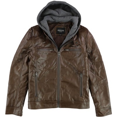 GUESS Mens Detachable Hood Faux-Leather Jacket