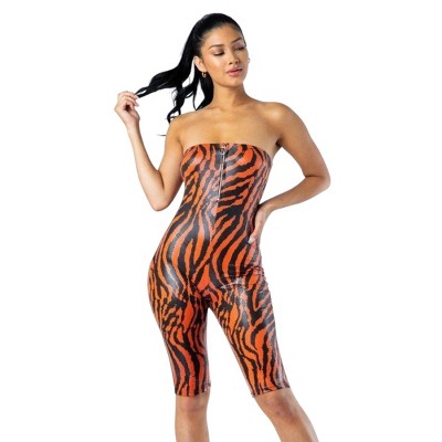 Slickblue Women’s Zebra Print Tube Romper with Front O-Ring Zipper, Trendy Jumpsuit, S-L, Yellow/Orange