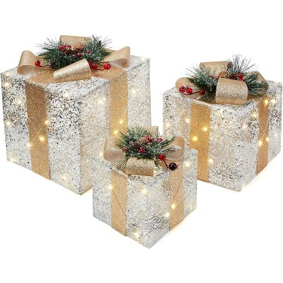 Set of 3 Christmas Lighted Gift Boxes, Gift Present Decorated Boxes with Ribbons & Bows for Indoor Outdoor Christmas Tree, Home, Yard, Lawn
