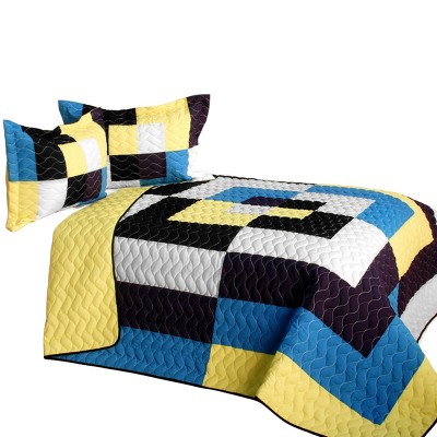 Slickblue Handmade Patchwork Quilt Set, Vermicelli Quilted, TC Fabric, Blue/Yellow, Full/Queen, 3pc