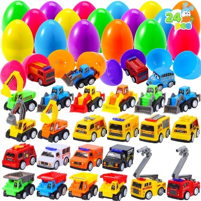 Joyfy 24 Packs Prefilled Easter Eggs with Construction Cars, Pull Back Car Vehicle Toys for Kid Easter Party Favors, Basket Fillers, Classroom Rewards