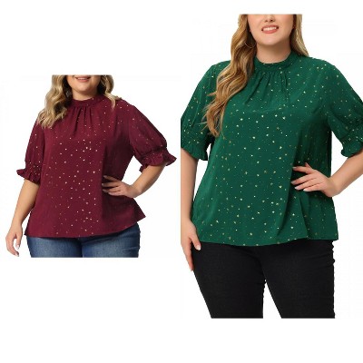 Agnes Orinda Women's Plus Size Glitter Sheer Double Layers Ruffle 3/4 Sleeve Pleated Tunic Top