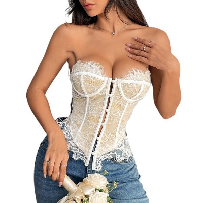 Clearlove Women's Lace Trim Low Cut Curve Button Down Strapless Corset Top Bustier Tube Tops
