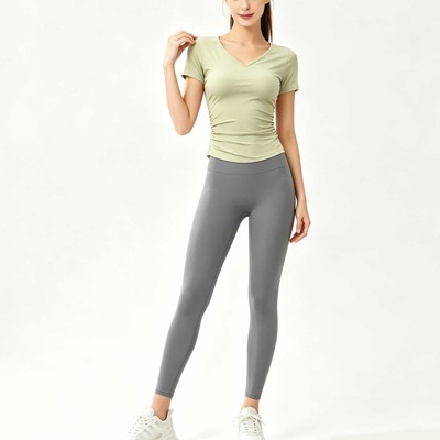 Women's 2 Piece Yoga Activewear Set, V Neck Ruched Top & High Waist Workout Leggings