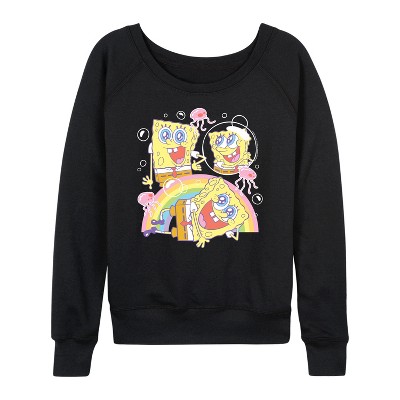 Women's - Spongebob Squarepants - Cute Face Rainbow-Women's French Terry Pullover Lightweight French Terry Wide Neck Long Sleeve Graphic Shirt