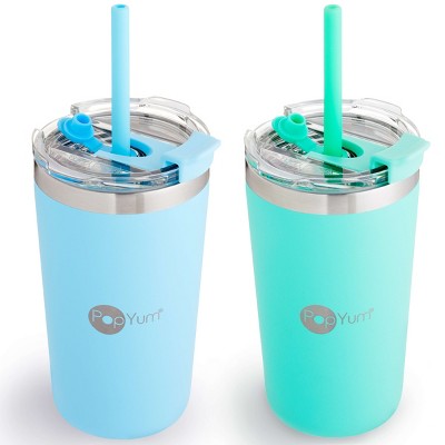 PopYum 13oz Insulated Stainless Steel Kids’ Cups with Lid and Straw, 2-Pack, Blue & Green, stackable, sippy, baby, child, toddler, tumbler